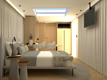 Estrutura de aço galvanizado; Acabamento externo em placas de fibra de vidro e vidros laminados 6mm + 6mm ou acrílico transparente, todos com película para proteção de calor e redução da visibilidade externa; Porta de entrada com fechadura inteligente; Porta de correr para entrada no banheiro; Proteção acústica com lã de vidro ou lã de rocha na parte interna das paredes; Sancas para instalação de cortinas na área de vidros.