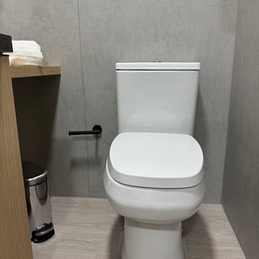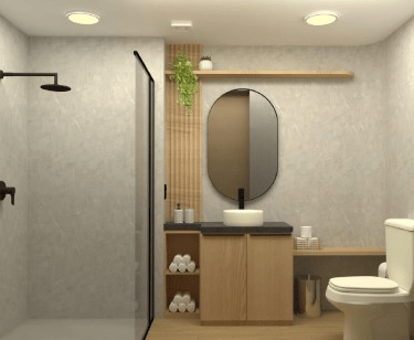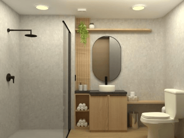 Vaso sanitário instalado; Registro monocomando; Pontos de água para chuveiro e lavatório; Piso em porcelanato; Paredes em placas de PVC.