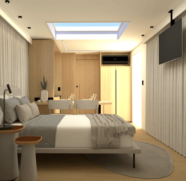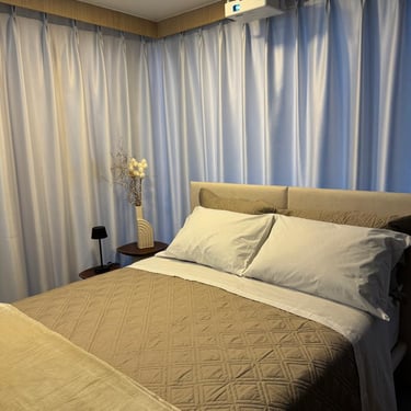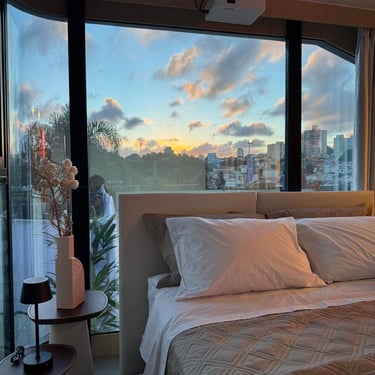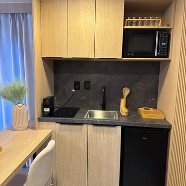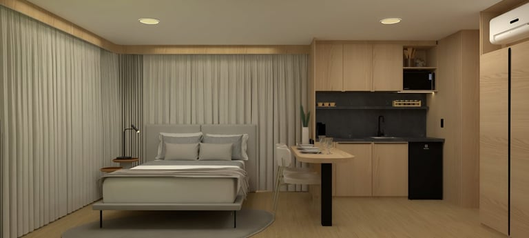 Cooktop indução 2 bocas; Porta toalha e kit acessórios para o banheiro; Chuveiro/ducha de parede; Lixeira de banheiro; Box de vidro temperado para o chuveiro; Ar condicionado 12.000 btus instalado.
