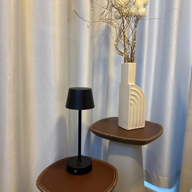 Mesa de centro alta e mesa de centro baixa; 2 cadeiras slim; Luminária de mesa.