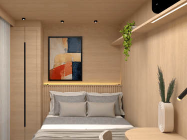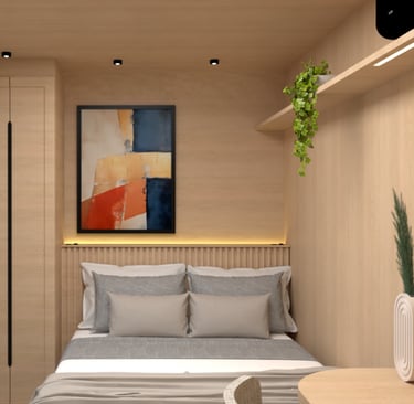 Balcão do lavatório do banheiro, com cuba e torneira devidamente instalado; Prateleira no banheiro; Prateleira no quarto; Armário de quarto; Mesa do quarto.
