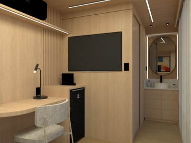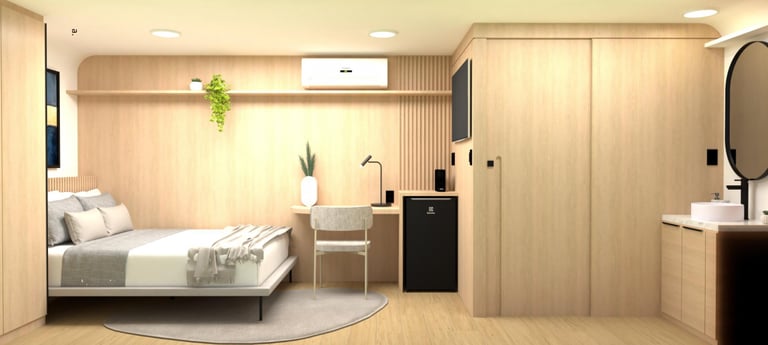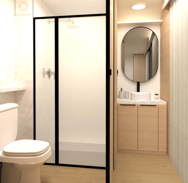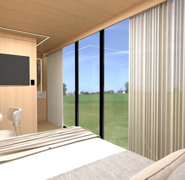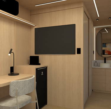 Estrutura de aço galvanizado; Acabamento externo em placas de fibra de vidro e vidros laminados 6mm + 6mm ou acrílico transparente, todos com película para proteção de calor e redução da visibilidade externa; Porta de entrada; Porta de correr para entrada no banheiro; Proteção acústica com lã de vidro ou lã de rocha na parte interna das paredes; Sancas para instalação de cortinas na área de vidros.