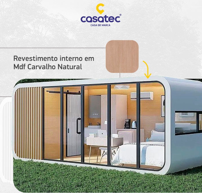 Teto em ACM; Paredes em MDF; Vidros laminados 6mm + 6mm ou acrílico transparente com película de proteção solar e visual; Piso da casa com revestimento vinílico; Piso do banheiro com porcelanato; Paredes do banheiro com placas de PVC.